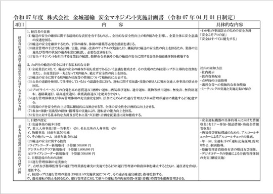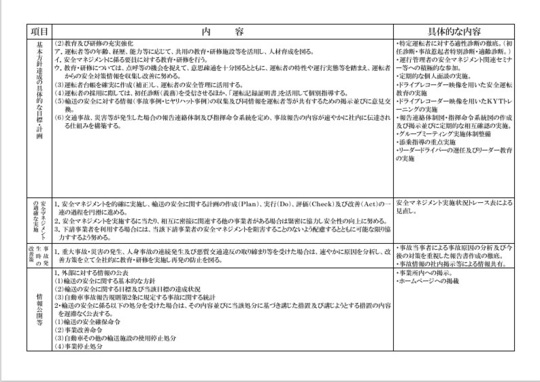 運輸安全マネジメントとは全ての事業者が安全性向上のための計画を作成して実施し、その効果を評価し、改善ポイントを整理しさらに改善計画を実施するという取り組みを行い、常に輸送の安全のレベルアップを図ろうとするものです。